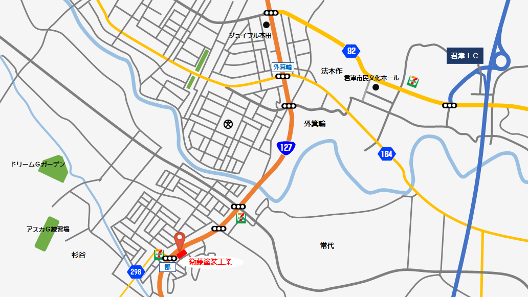 周辺地図 株式会社 衛藤塗装工業 本社 〒299-1127 千葉県君津市郡3-1-2 アクセス バスの場合 君津駅南口を出て、国道127号線約15分。 自動車の場合 木更津インターチェンジから5km ※駐車場約10台